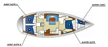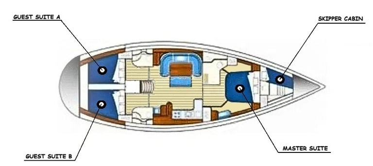 Anemeliá è uno yacht a vela OceanStar 51.2 costruito per sicurezza e comfort. Materiali robusti, cura dei dettagli, attrezzature, spazio… e ne ha davvero tanto! L’immagine qui sotto mostra la disposizione interna, con tre cabine doppie per gli ospiti, ciascuna con bagno privato.